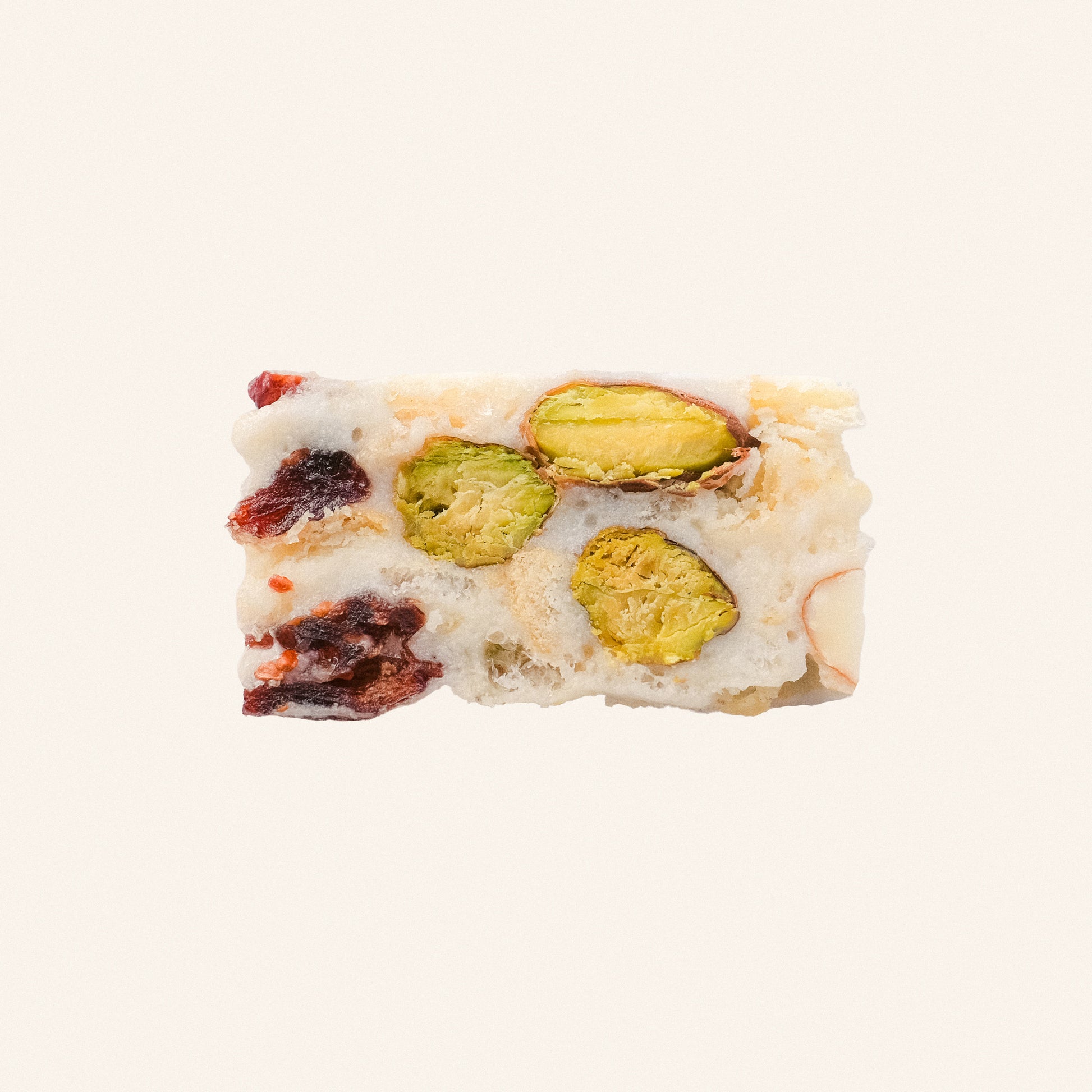 A refined milk nougat, delicately crisp with roasted almonds and pistachios, accented by the subtle tartness of cranberries.