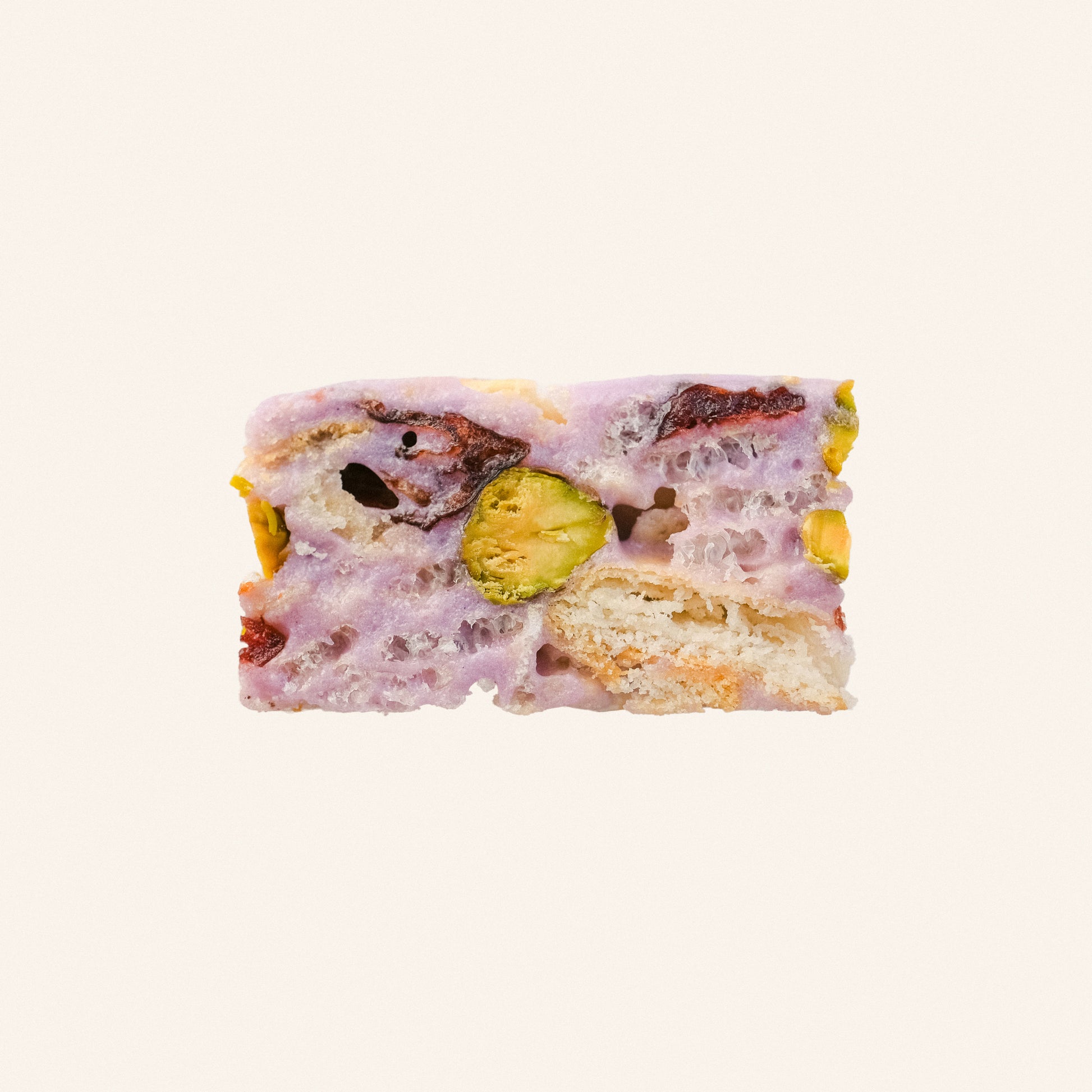 Fragrant taro nougats with creamy vanilla notes, accented by tart cranberries and a satisfying nutty crunch.